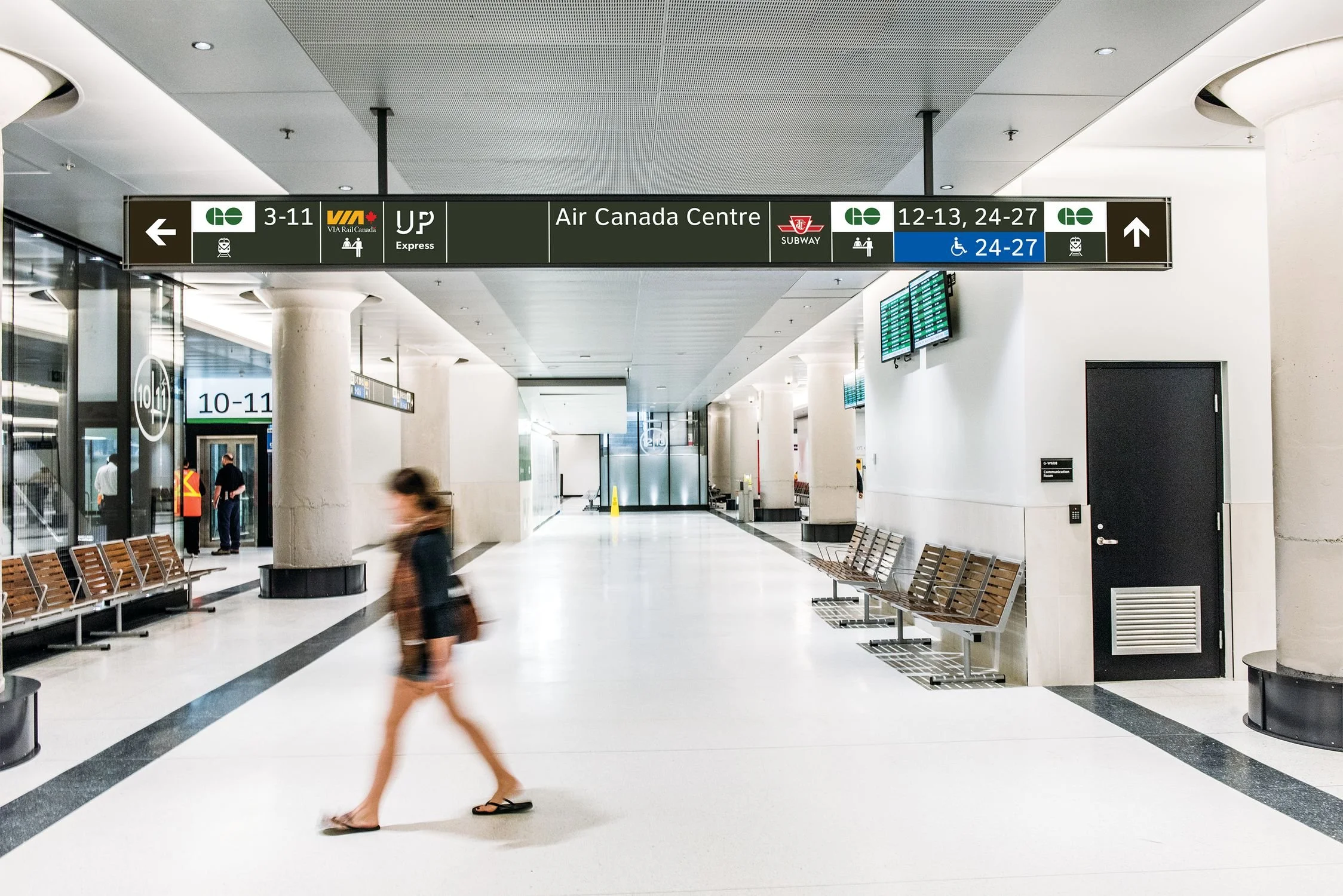 The current Ontario Transit Way Finding system is disjointed across the province, and a real problem leading to consumer confusion. This becomes a bigger issue for residents and tourists at one of Toronto’s busiest locations - The Union Station. Here is an example of the current signage.